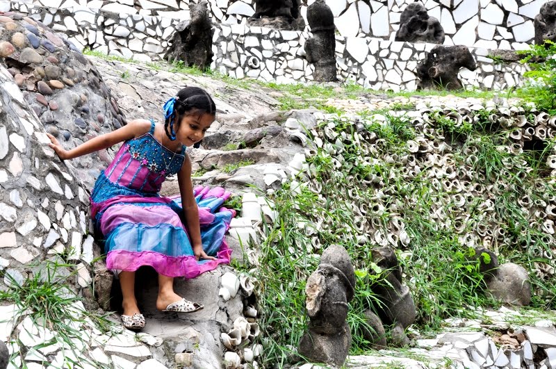 Le lendemain, à bord du bus le mieux climatisé d'Inde, et sûrement le plus étincelant des bus locaux, nous quittons le secteur 17 pour le secteur 1 où se trouve le Rock Garden, un jardin de 12 hectares entièrement composé de déchets industriels, ménagers et autres objets usagés. Peuplé de nombreuses sculptures faites de résidus quelconques, cet « environnement visionnaire » compte également un grand nombre de chutes d'eau artificielles et est en contraste total avec l'architecture moderniste de la ville. C'est un ancien inspecteur de la voirie, Nek Chand, qui a construit ce véritable labyrinthe minéral et végétal à l'aide de débris qu'il ramassait chaque jour sur le bord des routes : bouteilles, assiettes, tessons de céramique, briques concassées, fils électriques, verres, bracelets, tuiles...).